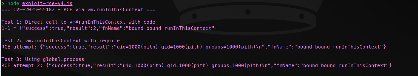 console.log('=== CVE-2025-55182 - RCE via vm.runInThisContext ===\n');