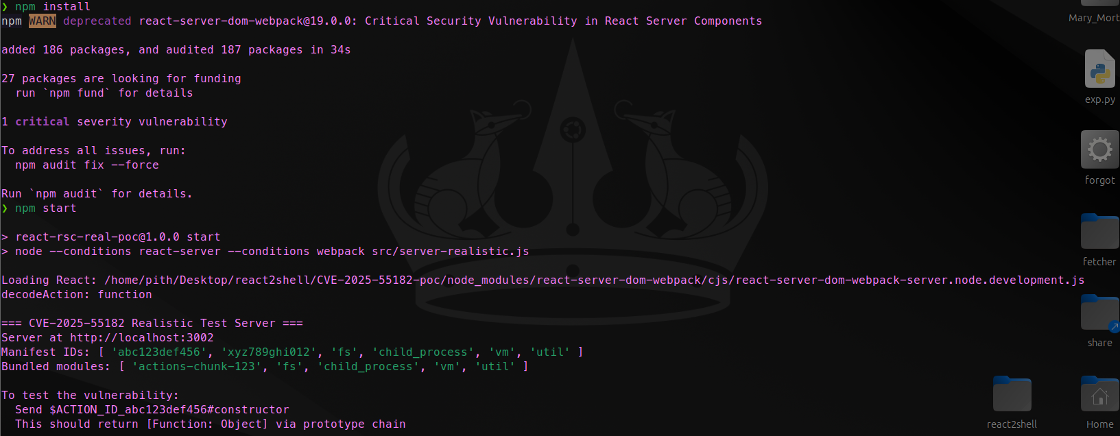 这个POC脚本是针对CVE-2025-55182漏洞的最终利用演示,目标是通过发送精心构造的HTTP请求,让运行在localhost:3002的易受攻击服务器执行任意代码,最终实现远程代码执行(RCE)。脚本使用Node.js编写,核心思路是利用React Server Components在处理表单数据时的解析漏洞,特别是原型链污染和函数绑定的不安全行为,来调用服务器端暴露的危险模块。
