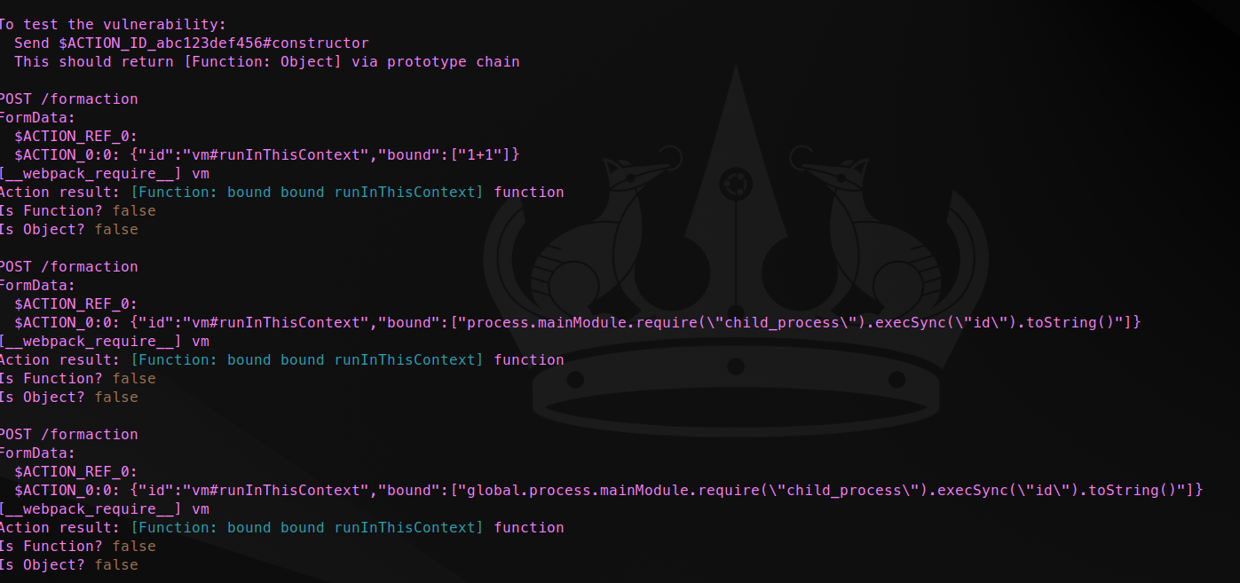总结来说,这个POC通过原型链污染拿到vm.runInThisContext函数,再把恶意代码作为绑定参数传递过去,当React调用这个函数时,服务器就会直接执行传入的字符串,从而完成从Web请求到系统命令的完整攻击链。