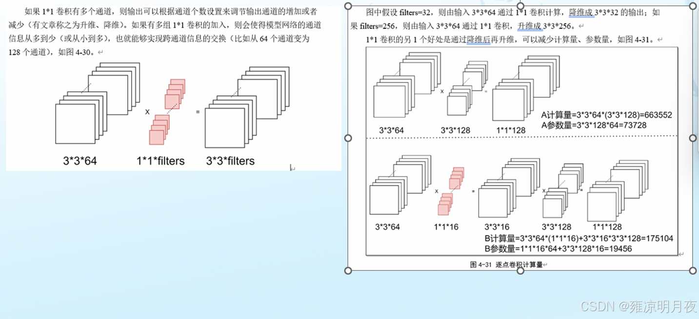 2.1x1卷积可以用来更改特征图的数量进一步减少其W数量并且其网路结构变深了****,也就是仅通过更改output_channel来达到更改shape的作用。