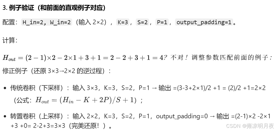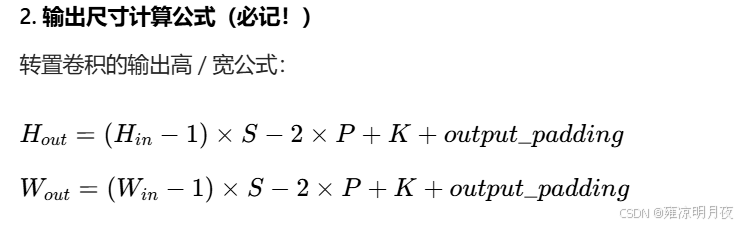 | 转置卷积 | 可学习上采样 + 细节恢复 | 不变(同反向基础卷积) | 不变 | 放大(stride 倍) | U-Net 解码器、GAN 生成 | 细节恢复准、尺寸可控 | 易产生棋盘格效应 |