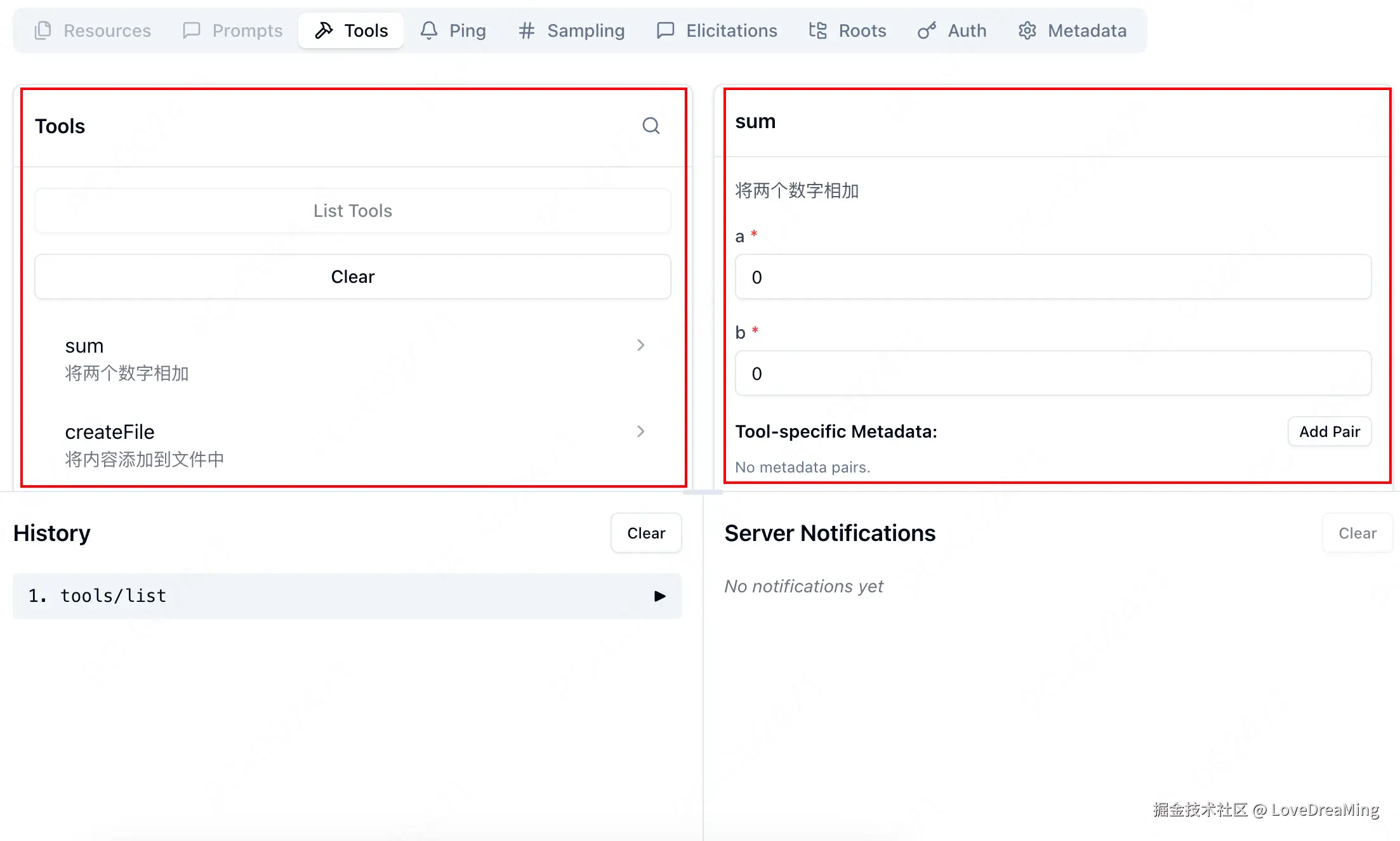 - 最后就可以在右侧的如下图两个红框内输入,调试MCP工具函数