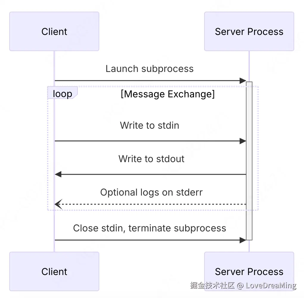 工具链与模型的协作,这种场景下,stdio 提供了一种最原始、最直接的通信方式。MCP 主要通过本地工具或进程来执行任务,不需要外部的网络支持或服务暴露。通过 stdio ,MCP 可以在不同的进程之间传递数据,保证了本地化、低延迟的需求。 - 无需网络,启动成本极低 :与传统的网络通信协议相比,stdio 的一个巨大优势在于,它不需要依赖网络连接。无论是