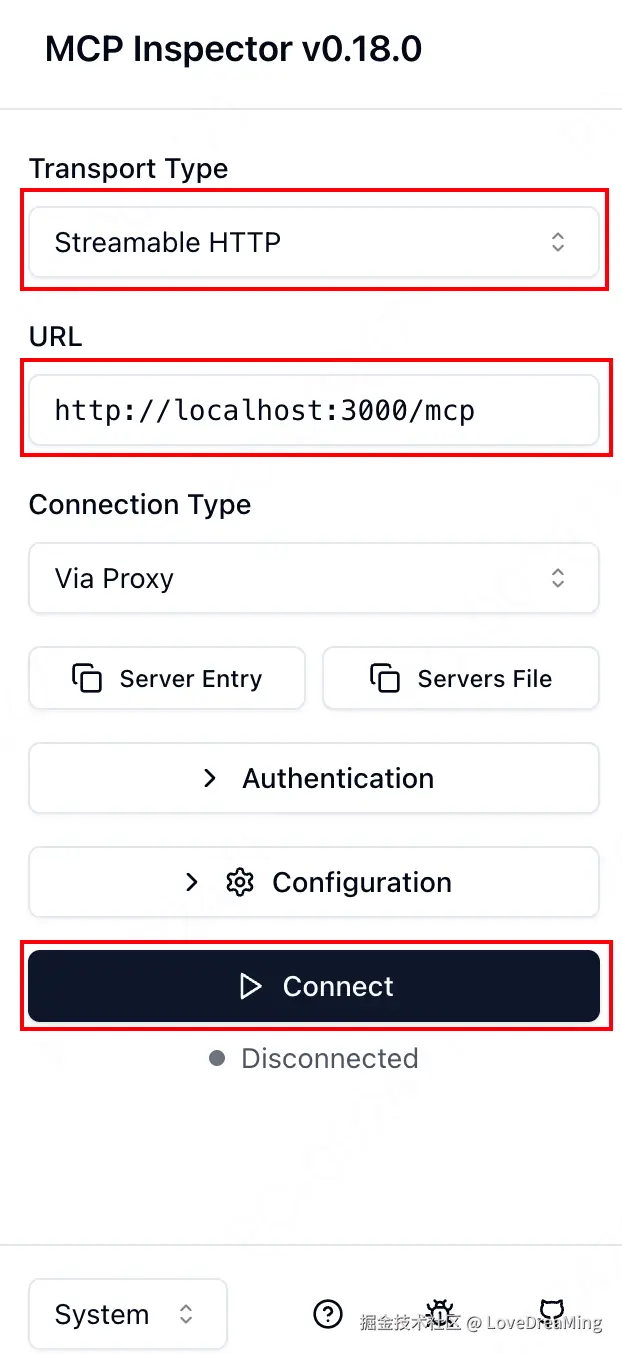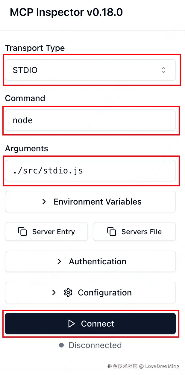 npx @modelcontextprotocol/inspector命令启动MCP检查器 - 打开的浏览器窗口里参数如下,点击Connect 就可以在右侧调试工具函数了