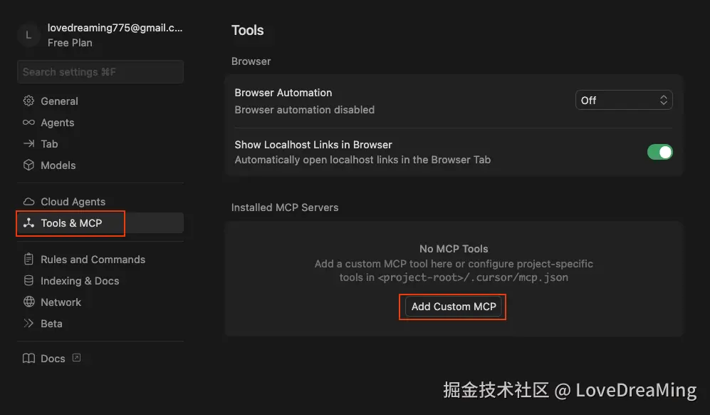 - 在Tools & MCP一栏,点击Add Custom MCP ,这时会打开mcp.json文件