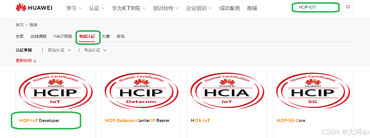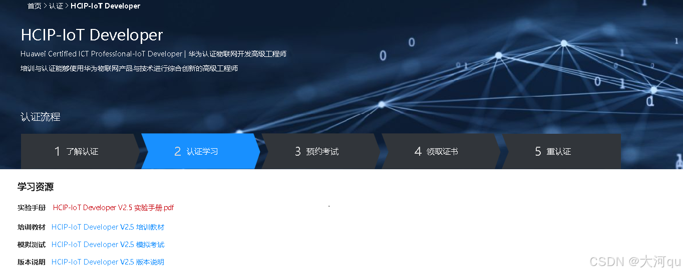 登录 华为人才在线,在菜单栏,认证 -> 资源中心,并在该界面右上角搜索 HCIP-IoT,可以搜索到 《HCIP-IoT Developer V2.5 实验手册.pdf(9.18MB)》,点击进入并下载即可。还有一种方式,我们可以在上图首页直接搜索 HCIP-IoT,然后在搜索结果中选择 '考试认证',