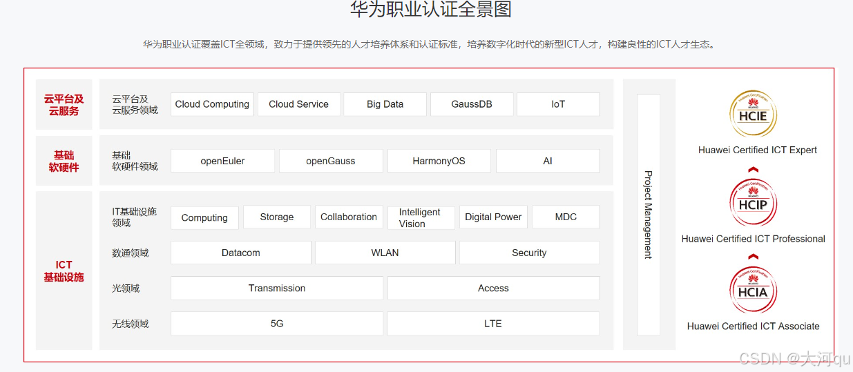 华为云职业认证覆盖多个技术领域,设计了HCIA、HCIP、HCIE三个层级,旨在提高学员在业务理解、架构设计等方面的综合能力。它涵盖了云服务、鲲鹏、物联网、人工智能、大数据、GaussDB、openGauss等多个技术领域。这一认证不仅涉及云服务的基础、开发、管理和架构设计等多个范围,更旨在帮助学员全面提升在业务理解、架构设计、应用开发等方面的核心能力。在官网,关于华为云职业认证,,如下,