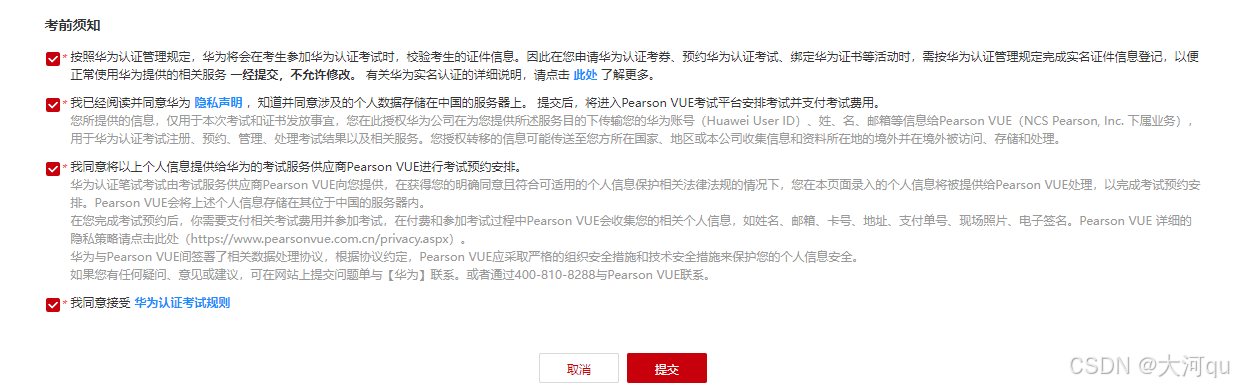然后系统开始链接VUE官网,之后让你阅读Huawei Certification 政策,自己看看就行,不多说了,点击同意即可。再之后,弹出来考点选择界面,输入你的地址进行搜索,选择一个你心仪的考点,如,