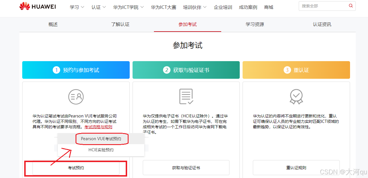 按照上图进入'职业认证'界面,并选择参加考试选项卡,https://e.huawei.com/cn/talent/cert/#/careerCert