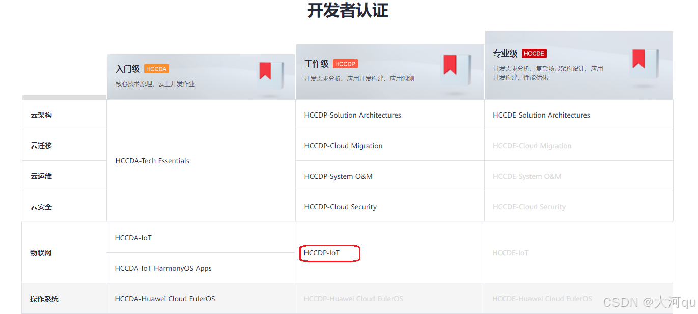 华为云开发者认证和职业认证体系下,都有IoT方向,前者叫HCCDP-IoT,后者叫HCIP-IoT。华为认证体系中的 HCCDP(Huawei Cloud Certified Developer Professional) 和 HCIP(Huawei Certified ICT Professional) 在考纲上是部分重叠的,但则重点不同。