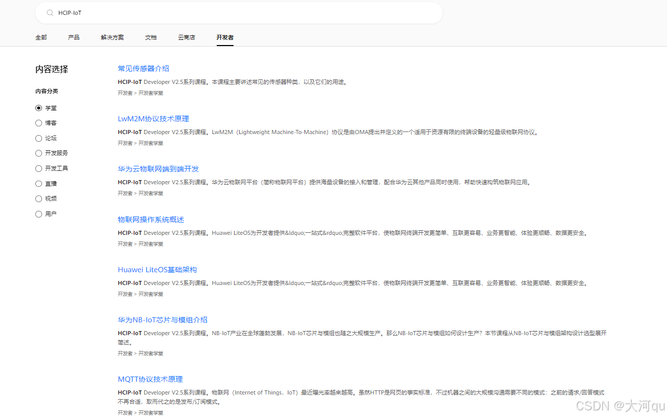 你可以在华为开发者学堂中搜索任何你感兴趣的资料,如使用"HCIP-IoT"做关键词,部分搜索结果如下,