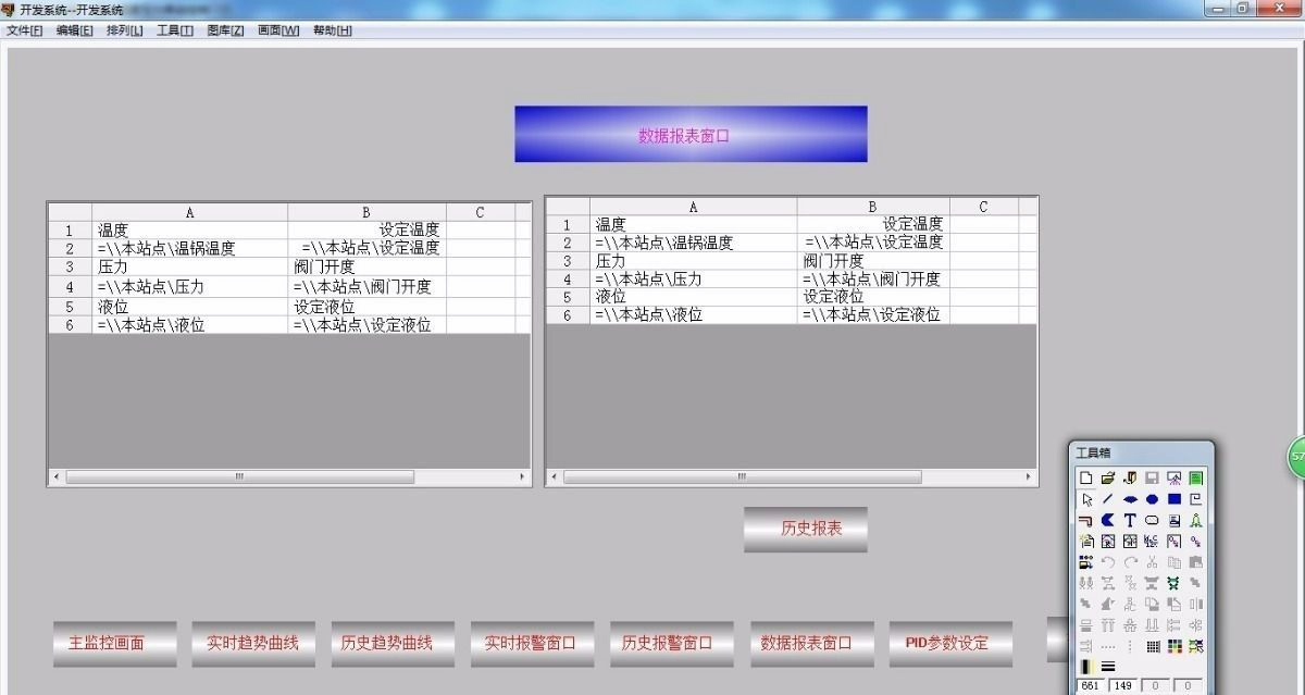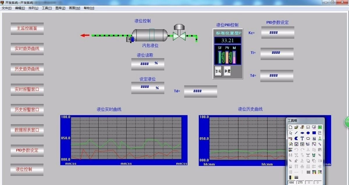 先看锅炉控制的三大金刚------水位、压力、温度。在组态王里做画面组态时,我习惯先用脚本做个动态模拟器: