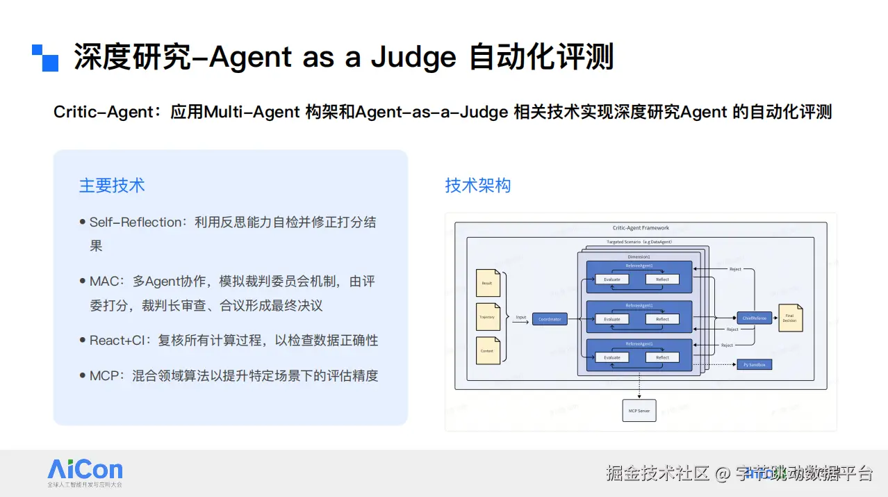 接下来谈自动化评估技术。这是业界相对前沿的话题,大家可能听过 "LLM as a Judge" 或 "LLM Judge"。我们最新的探索是用 Agent 来评测 Agent。原因很简单:写一份数据分析报告,没办法把数据直接丢给大模型就指望一次性产出完整结果,中间需要大量 Agent 能力来完成过程性的工作,所以在评测侧同样要引入 Agent 技术。