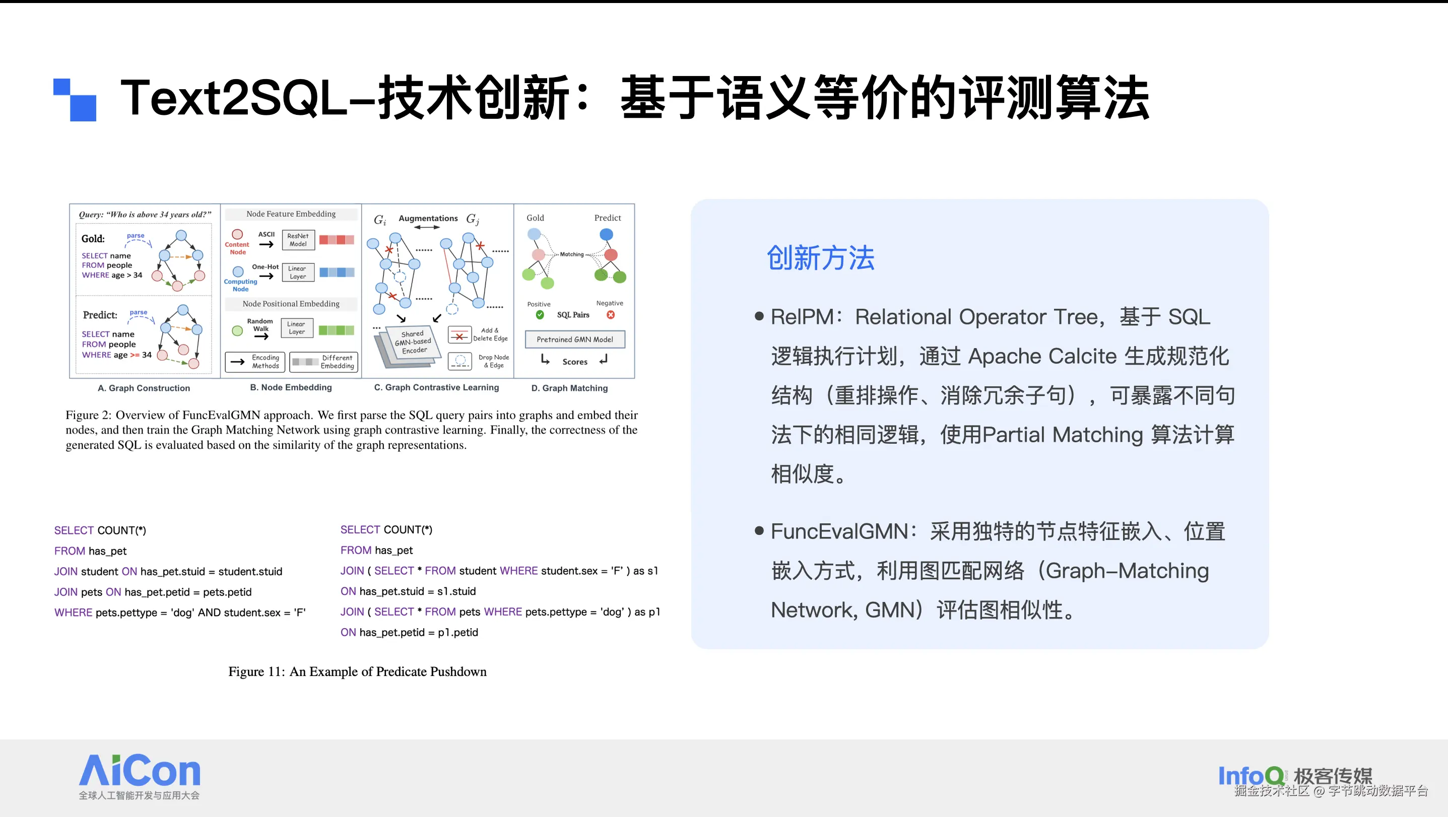 第二个方法,我们把节点之间的引用关系建立起来:参考答案是一张图,预测答案也是一张图,然后训练一个图匹配网络(Graph-Matching Network,GMN )来计算两条 SQL 在语法/表达上的相似度。基于语法树的匹配这一路,我们称为 RelPM (在执行层面的语法树上做 Partial Matching 的局部匹配):用规则做局部比对并赋权,得到 0~1 的相似度分数,已经明显优于传统做法。进一步,在 FuncEvalGMN 上,无论对比基于执行正确性的评测、基于文本/语义相似度的评测,还是一些基于 BERT 的预训练模型,我们的效果都有显著提升。在业务侧,这套方法也已经成为我们数据领域的核心算法之一。