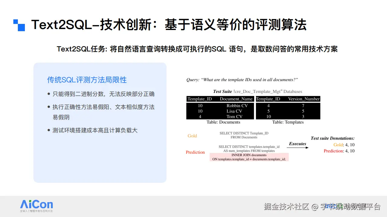 然而实践表明,这一方法易产生误判。根源在于测试数据分布并不完备,可能存在"非等价 SQL 执行结果相同"的情况。例如,age > 34 与 age ≥ 34 在测试集中恰无 34 这一边界值时,二者输出一致,导致错误地判定为正确。这里放一个稍微复杂点的例子:我们的 gold(ground truth) 标准答案其实是一条很简单的 SQL,问题是"文档中哪些 template_id 被使用过"。但模型在预测时,去和另一张 template 表做了 INNER JOIN,按 id 关联。肉眼一看就知道两者不是一回事。按理说,放到设计更严谨的数据集上,应该能把差异测出来;可不幸的是,在 Spider 上两条 SQL 的执行结果一模一样,最终造成了误判。
