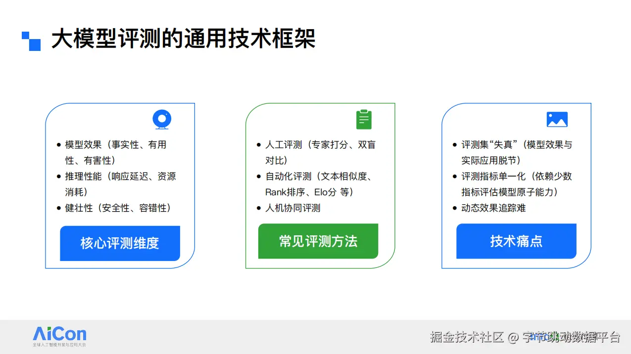 明确了该"看什么",接下来就是"怎么评"。在实际工作中,当前的常见评测方法有以下几种: 首先人工评测。在大模型生成带有主观性的内容时,比如一次性生成几千张创意图片,哪个更好、哪个更差,通常要先请领域专家过一遍,并据此写出清晰的评价标准------我们认为什么是"好",什么是"坏";其次是自动化评测。业界普遍的做法大致有几类:一类是客观题(单选或多选),便于直接做结果匹配;文本类会更难一些,常见思路是和标准答案做相似度比较,配合相应算法和指标,比如 BLEU、ROUGE 等;还有一类是基于排序的评估(rank),在 RLHF 里就很典型------不是给一个绝对分,而是让人对多个候选进行相对优劣比较,从而完成与人的偏好对齐。此外,人机协同评测。很多场景里,纯自动化还达不到足够准确、足够让人放心的程度,于是通常采用机器先给出初步结论和建议,再由人工复核与定判。