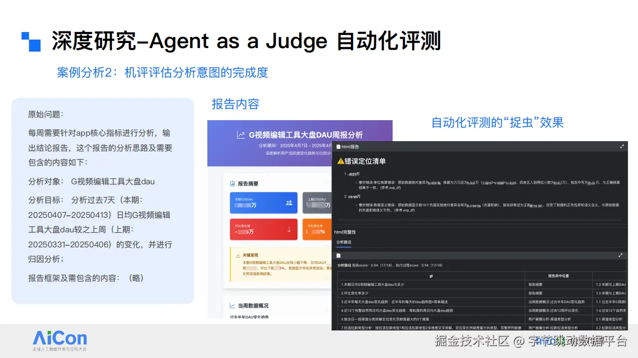 第二个例子,我们评估的是"分析意图的完成度"。左边是题目:对 DAU 数据做分析;下面先定义分析对象,再给出一套完整的分析框架,也就是要从哪些角度展开。右边是自动化评测页面的截图。红框里可以看到:这个题目一共有 18 个分析意图,这份报告完成了 17 个,对应得分 0.94。系统还会标注哪一个意图没有完成,已完成的意图在报告中对应的是哪些章节。由此能直观看到机评在这个场景下的实际效果。