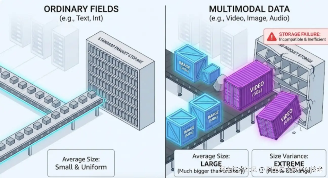 传统列式格式(如 Parquet)将多模态数据与结构化字段混存,导致即使只查用户 ID,也需加载整个含视频的大文件,I/O 效率极低。