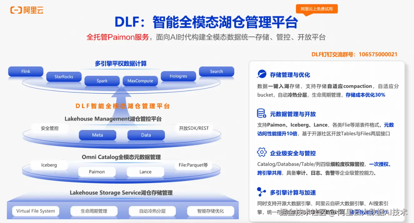 阿里云DLF 在云上提供全托管的Paimon存储服务,支持Paimon的智能存储优化与冷热分层。同时,DLF提供安全、开放、支持全模态数据的一体化Lakehouse管理平台,深度融入兼容其他例如 Iceberg、Lance 等主流格式,无缝对接 Flink、Spark 等计算引擎,,为 AIGC 与多模态智能应用提供高性能、低成本、易治理的数据基础设施。