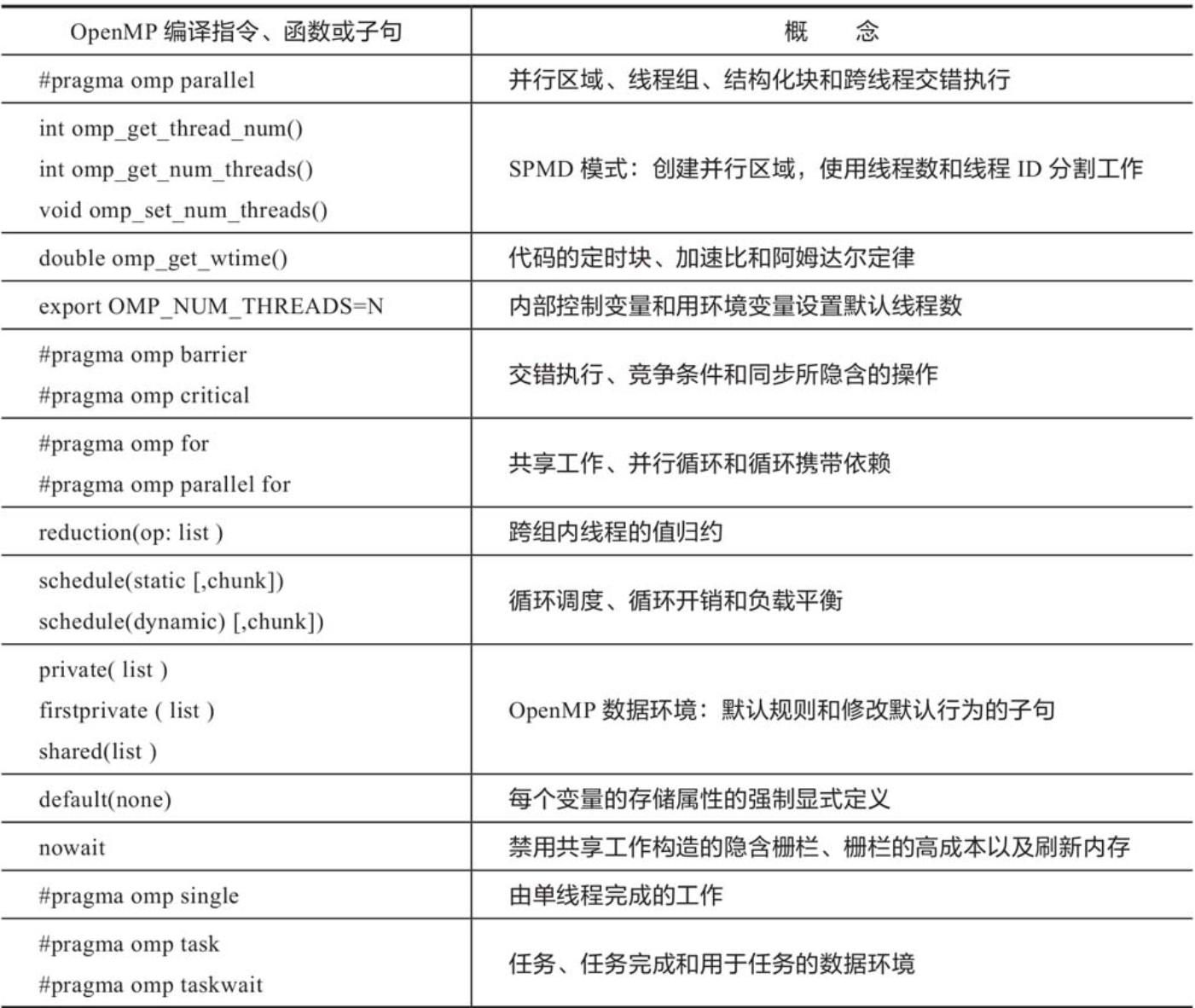1.构成OpenMP通用核心的编译指令、运行时库函数和子句以及相关的多线程计算基本概念: