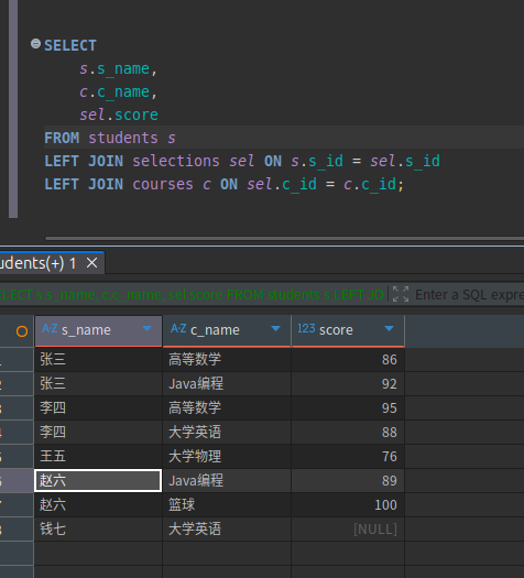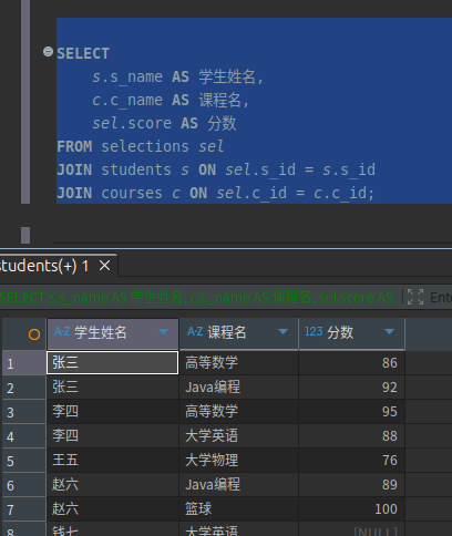 场景 1:基础联表 (INNER JOIN 或 JOIN) 查询所有选了课的学生姓名、课程名和分数: