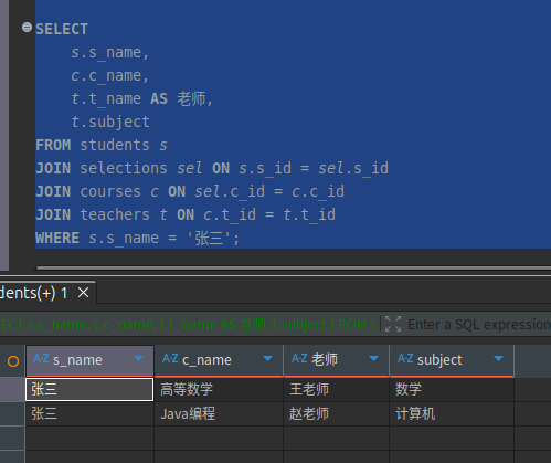 场景 2:多表联查 (包含老师信息) 查询学生张三选修的课程,以及该课程的任课老师: