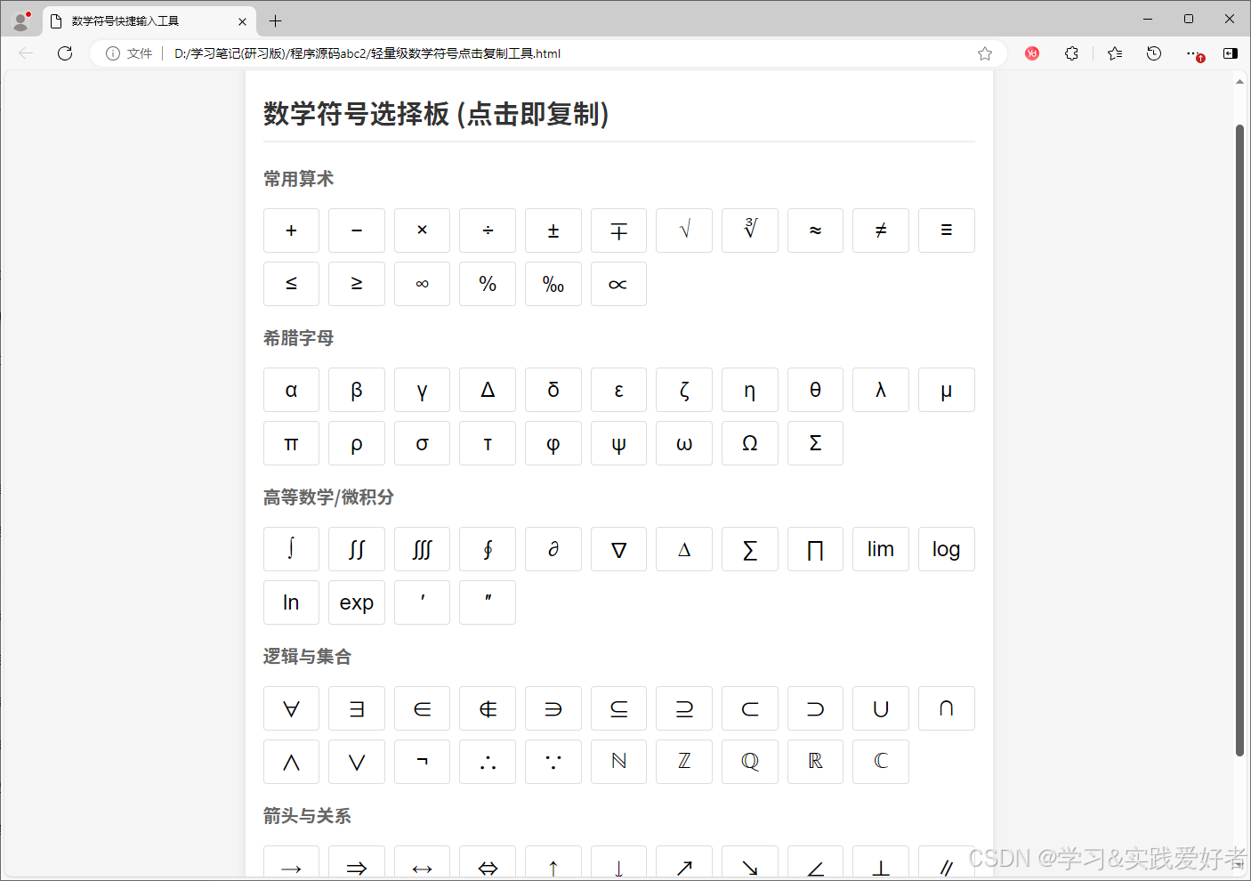 点击任意数学符号,即可自动复制到剪贴板,直接粘贴到需要的地方(Word、PPT、公式编辑器、网页等)。这个工具是纯前端网页,无需安装、无需部署,本地即可运行,使用零门槛------点击符号一键复制。