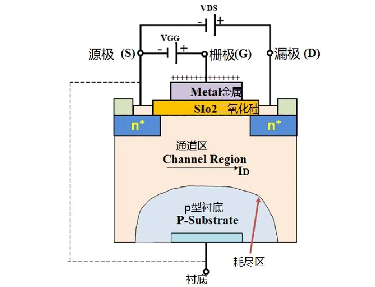 mos管的⼯作取决于MOS电容,它是源极和漏极之间的氧化层下⽅的半导体表⾯。只需分别施加正栅极电压或负栅极电压,即可将其从 p