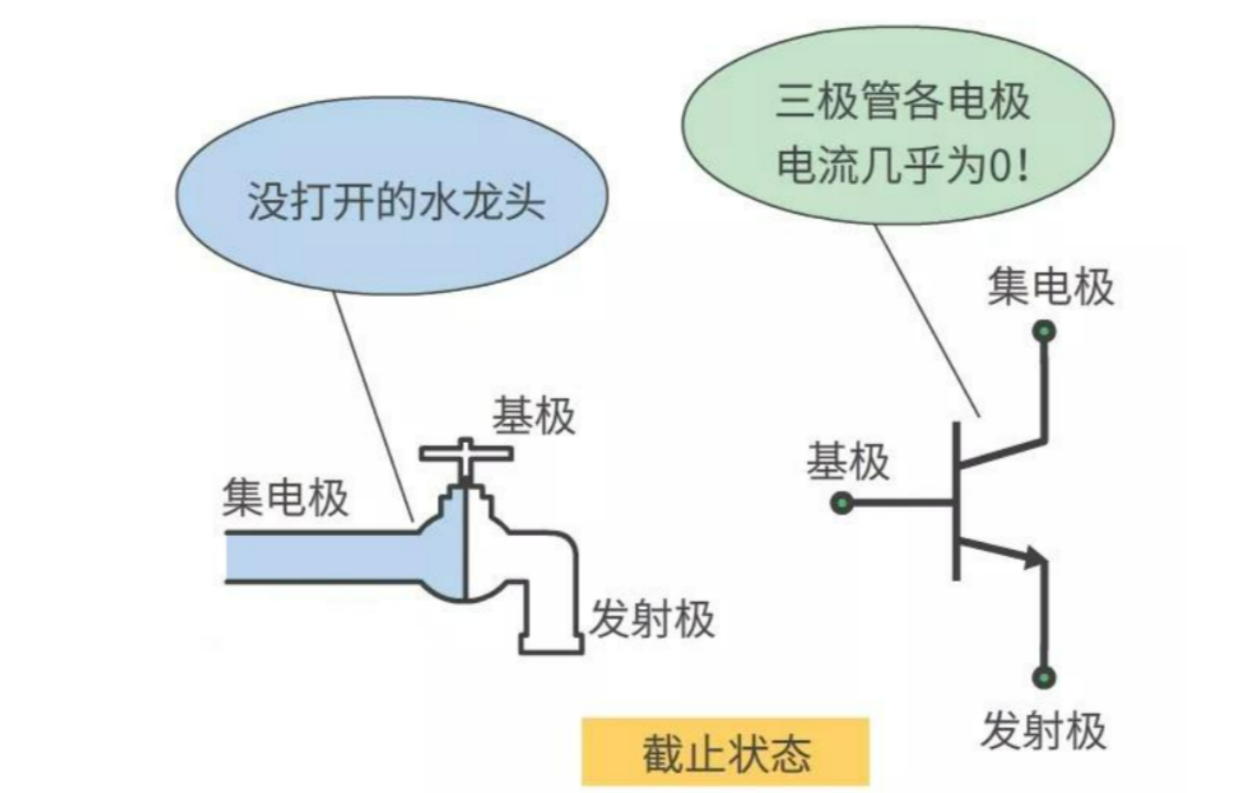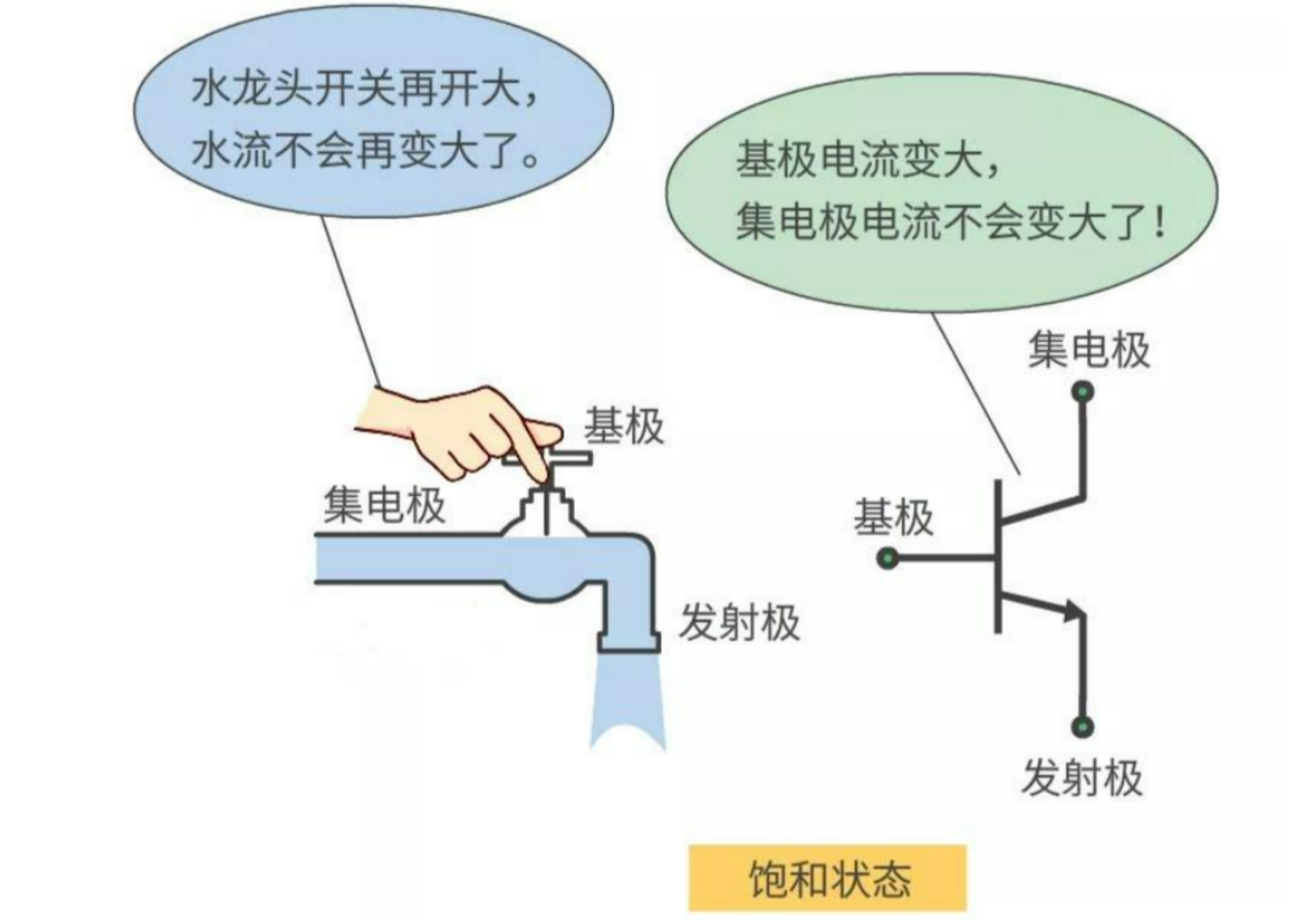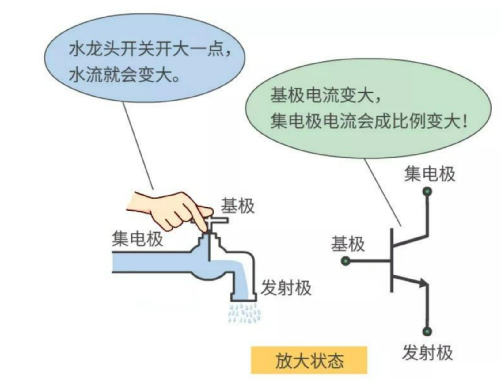 在放⼤状态下,就相当于是⼀个受控制的⽔⻰头,⽔⻰头流出⽔流的⼤⼩受开关(基极)控制,开关拧⼤⼀点,流出的⽔就会⼤⼀点。