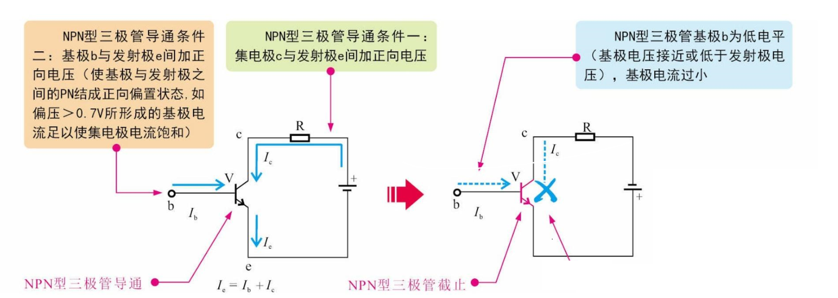 基极(B)端加上⼀个⾼电平,NPN三极管导通。