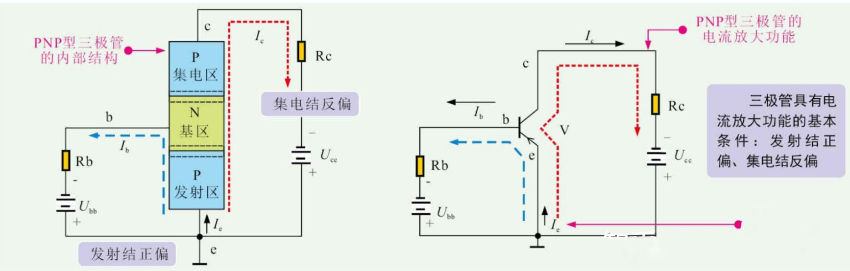 三极管基极(b)电流最⼩,且远⼩于另两个引脚的电流;发射极(e)电流最⼤(等于集电极电流和基极电流之和);集电极(c)电流 与