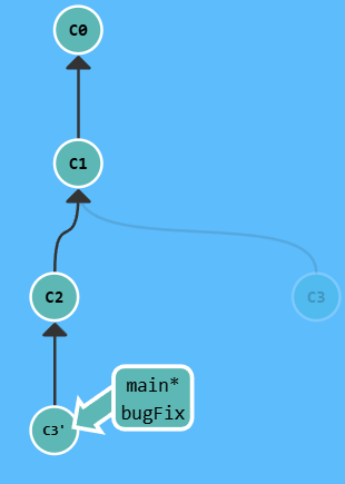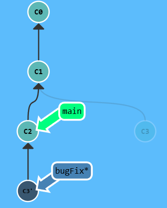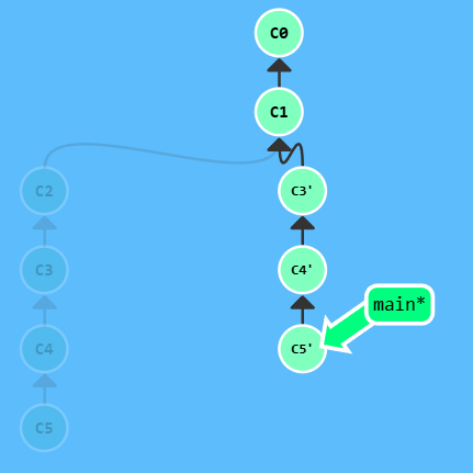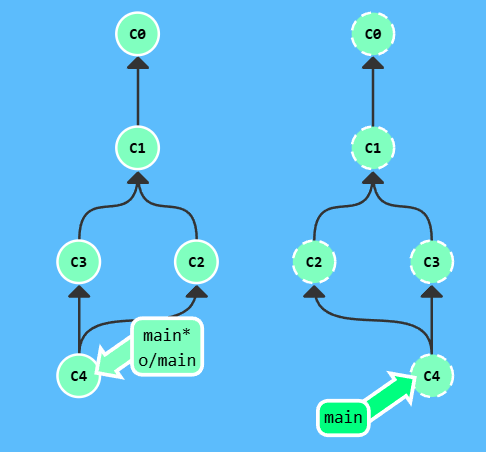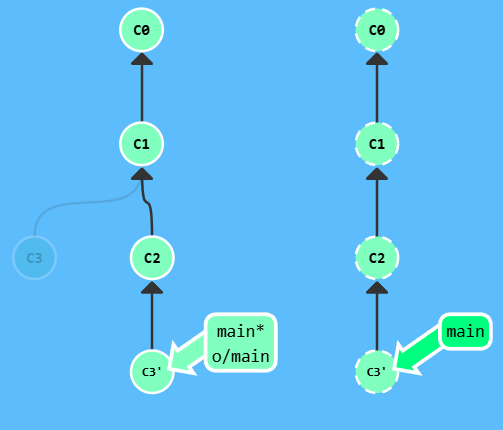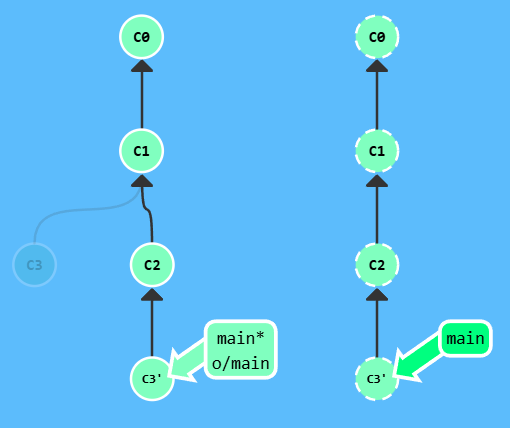 注意,提交记录 C3 依然存在(树上那个半透明的节点),而 C3' 是我们 Rebase 到 main 分支上的 C3 的副本。