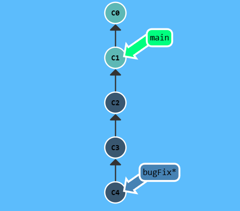 我们想要把 bugFix 分支里的工作直接移到 main 分支上。移动以后会使得两个分支的功能看起来像是按顺序开发,但实际上它们是并行开发的。