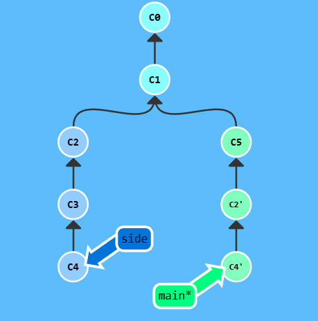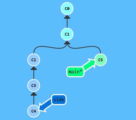这里有一个仓库, 我们想将 side 分支上的工作复制到 main 分支,你立刻想到了之前学过的 rebase 了吧?但是咱们还是看看 cherry-pick 有什么本领吧。