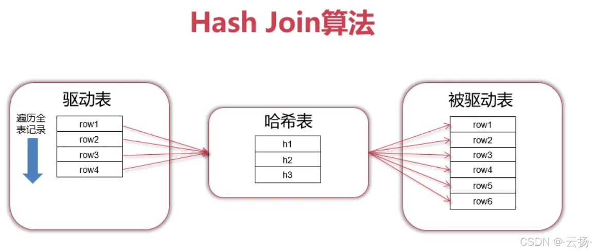 | Hash Join | 驱动表构建哈希表→被驱动表逐行通过哈希函数匹配 | MySQL 8.0.20后,被驱动表无索引 | 减少IO,比BNL更省资源 |