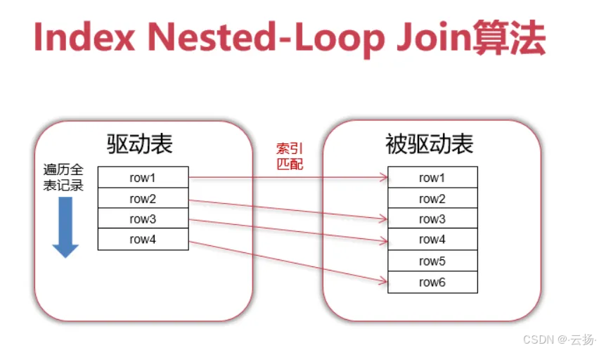 | Index Nested-Loop Join | 驱动表每行→通过索引定位被驱动表匹配数据 | 被驱动表关联字段有索引 | 扫描行数少,依赖索引效率 |