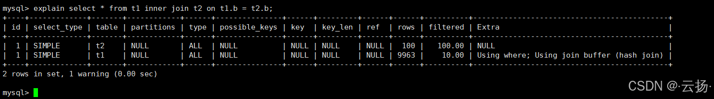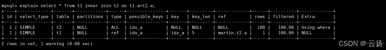 explain select * from t1 inner join t2 on t1.a = t2.a;