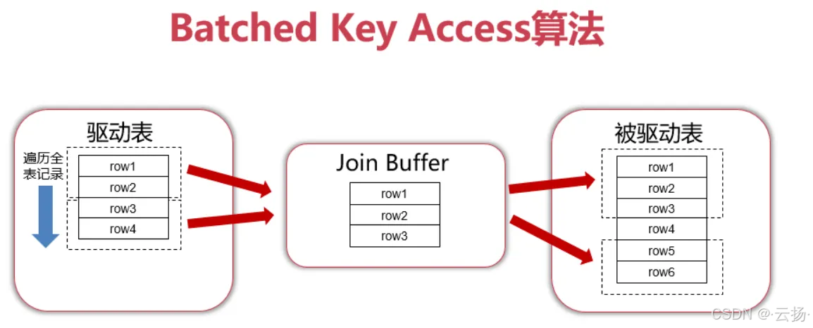 | Batched Key Access | 驱动表数据批量入join_buffer→MRR接口排序主键→批量匹配被驱动表索引 |