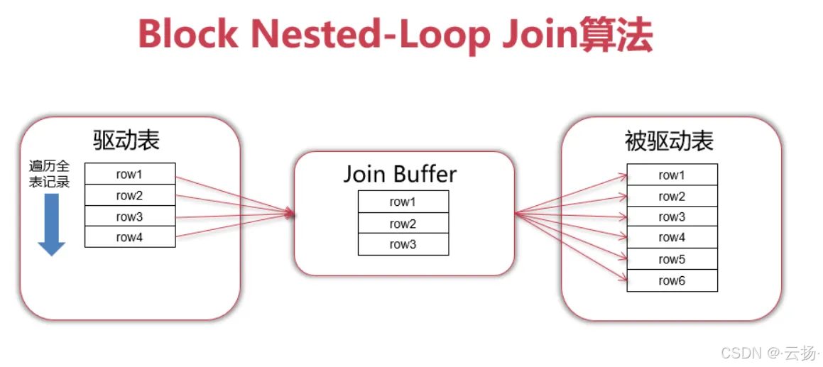 | Block Nested-Loop Join | 驱动表数据批量写入join_buffer→被驱动表每行与缓冲区数据对比 |