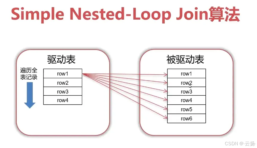 | Simple Nested-Loop Join | 驱动表每行→被驱动表全表扫描匹配 | 无(MySQL未实际采用) | 逻辑简单,扫描行数m*n,效率极低 |