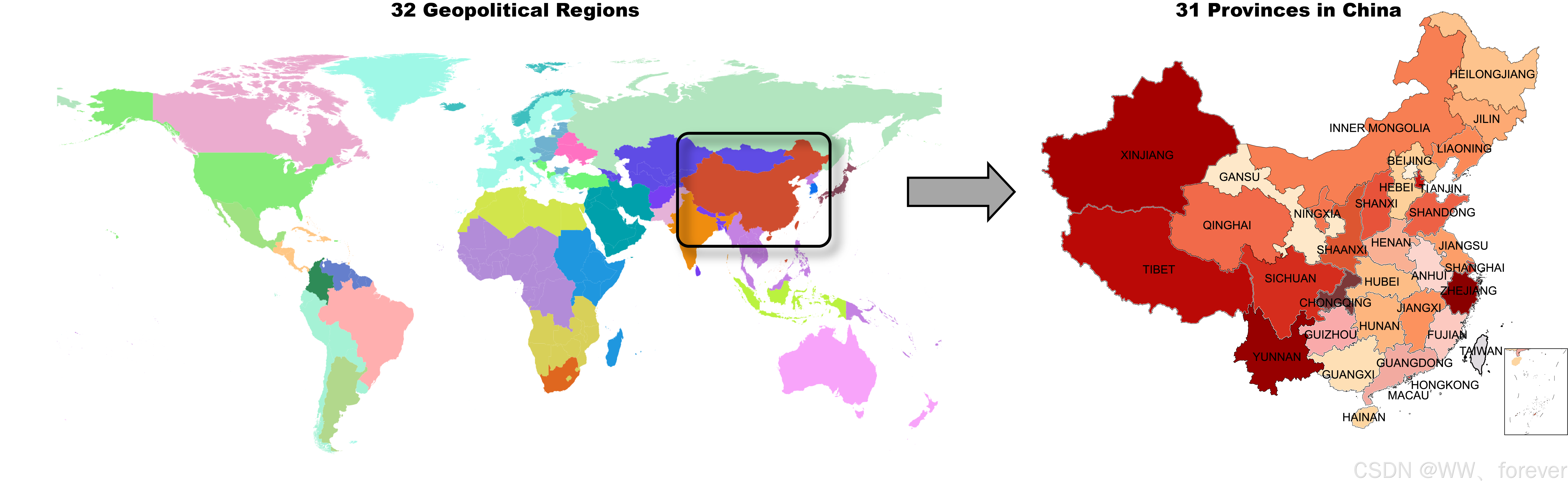 - GCAM 将全球划分为 32个地缘政治区域(如美国、中国、欧盟、印度等)。
