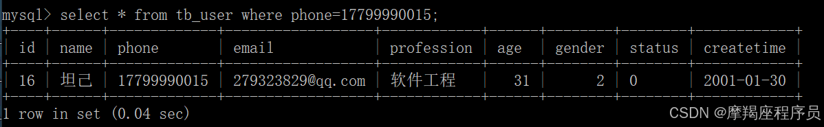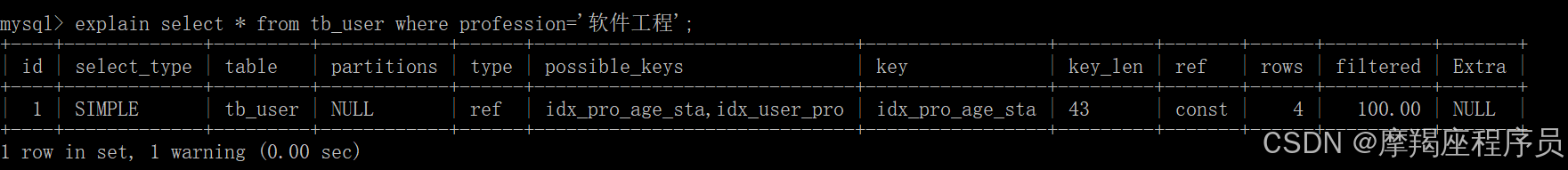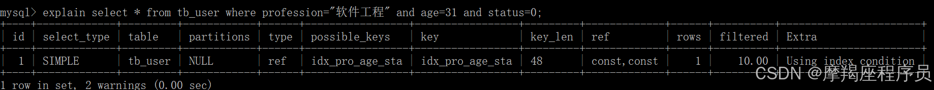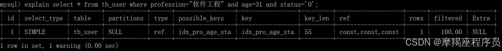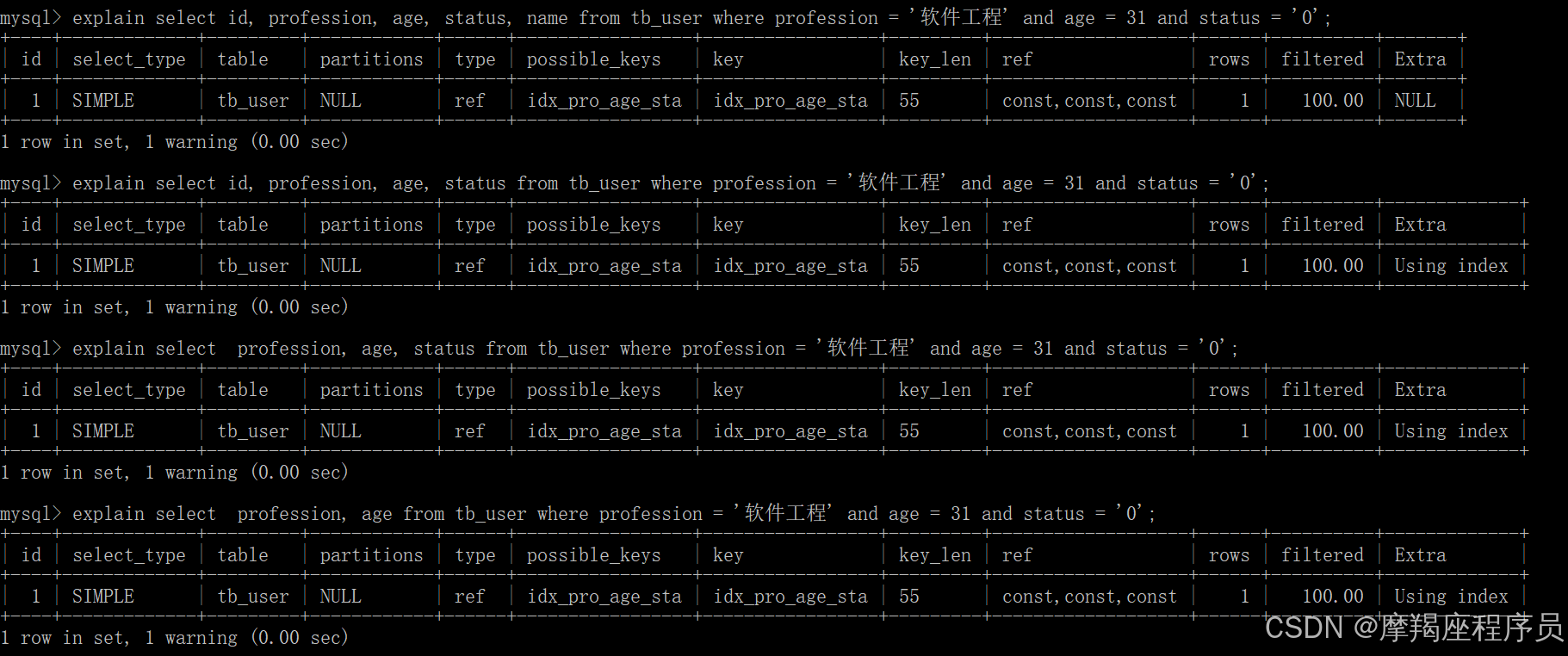 explain select * from tb_user where profession='软件工程' and age=31 and status='0'; explain select * from tb_user where profession='软件工程' and age=31 and status=0;