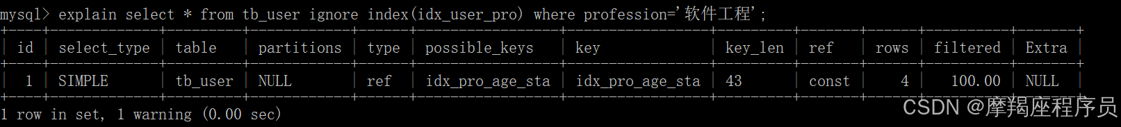 explain select * from tb_user ignore index(idx_user_pro) where profession='软件工程';