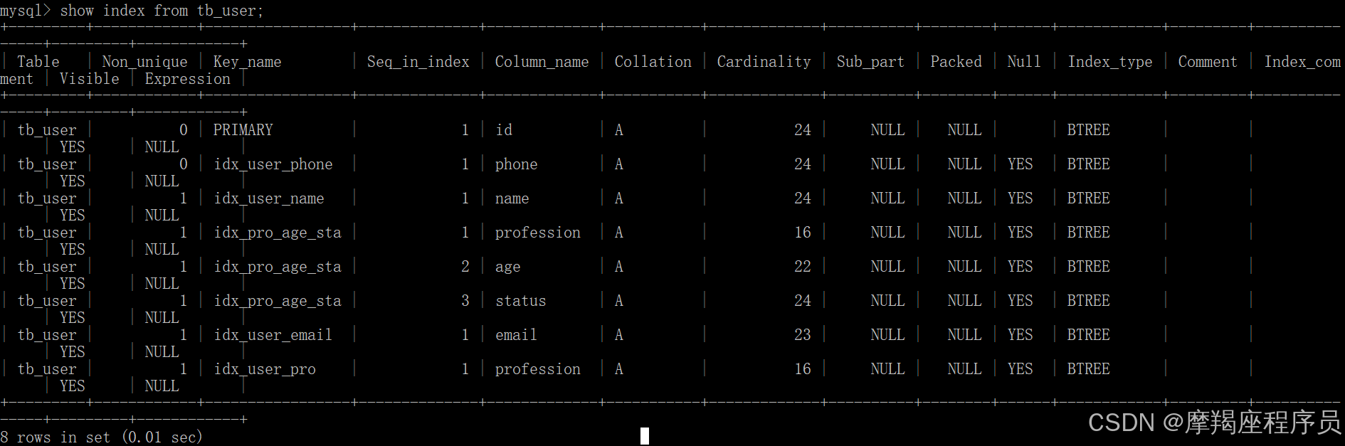 show index from tb_user; explain select * from tb_user where profession='软件工程'; // mysql数据库使用的是联合索引